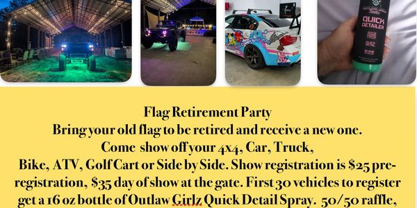 RED, WHITE AND BOOTS flag retirement party and show. Come join us for food, fun, music, dance, game, flag retirement ceremony, 50/50 raffle, prizes and just plain boot stomping, mud slinging fun on the farm!